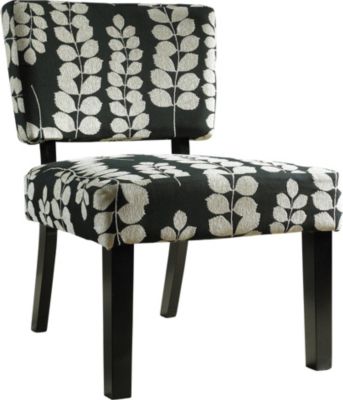 Highlight an office space living room or bedroom with a pretty pop of color in this convenient accent chair. A deep black background with floral design brightens any room and provides extra seating for entertaining. Functional and comfortable Plush polyurethane foam padding Engineered wood with dark brown finish Approx. 271/2"W x 27"D x 34"HPolyester/rayon upholstery Assembly required Limited warranty Read more